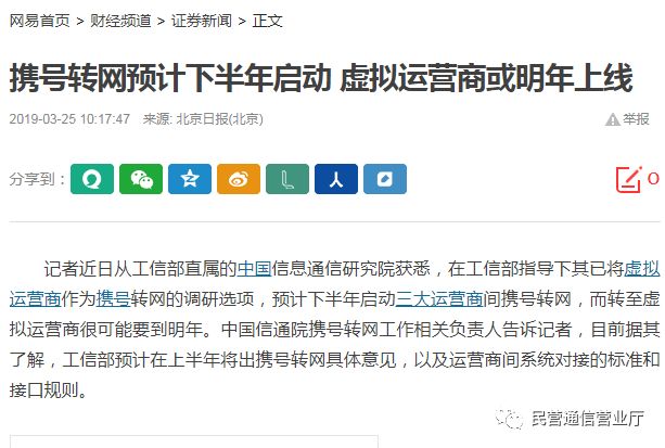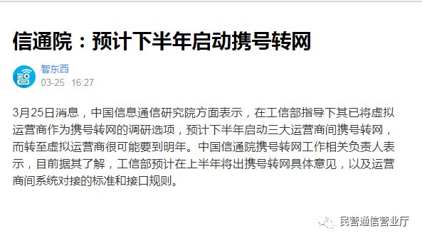 3月25日消息,中国信息通信研究院方面表示,在工信部指导下其已将虚拟运营商作为携号转网的调研选项,预计下半年启动三大运营商间携号转网,而转至虚拟运营商很可能要到明年。中国信通院携号转网工作相关负责人表示,目前据其了解,工信部预计在上半年将出携号转网具体意见,以及运营商间系统对接的标准和接口规则。